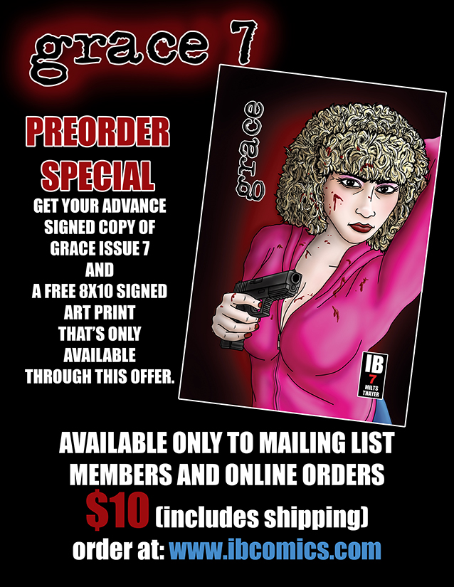 We have a lot of exciting news. First off, look above. Grace 7 is done and at the printers! Now is your chance to get it ahead of time! And you will also get a special limited edition 8x10 print. Go to www.ibcomics.com to order yours NOW!
