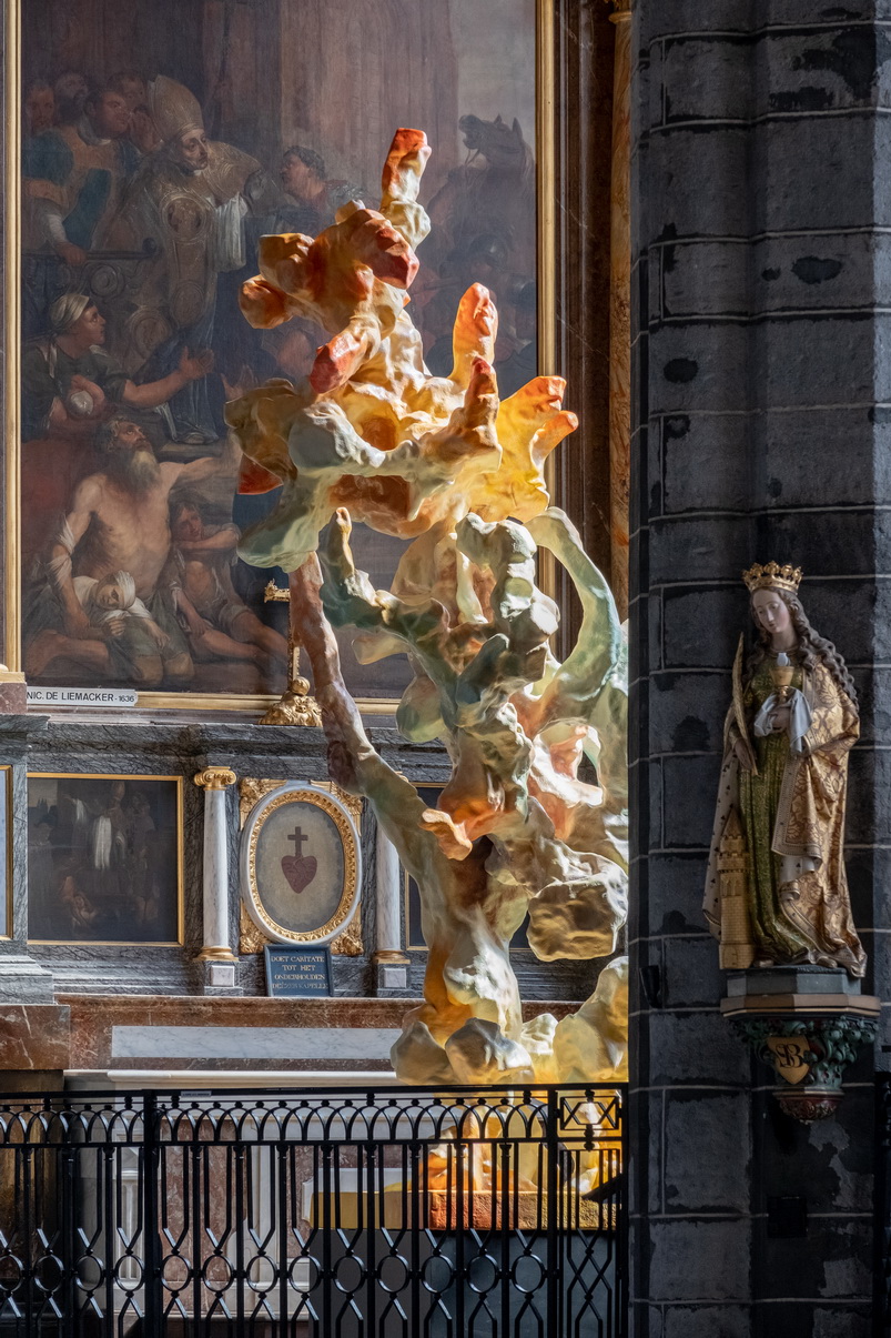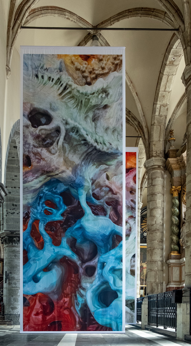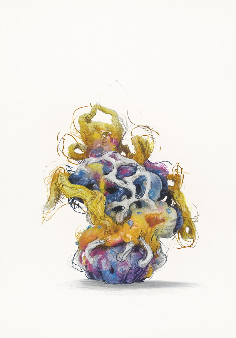 These mutations of skin and hide, man-made fossils—from within or outside of known evolutionary processes, whether intentional or the fruits of blind chance—demonstrate their viability in an array of universes. Unabashedly radiating garish colours, they ask about the meaning of their existence: are they, as they seem, part of a dystopian landscape, taking first breaths in the silence following a cosmic storm? Or are they the pulpy beginnings of a new technological era?