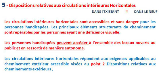 Description de l'image ci-dessus : Les dispositions relatives aux circulations intérieures horizontales sont identiques dans l'existant et dans le neuf. Les circulations intérieures horizontales sont accessibles et sans danger pour les personnes handicapées. Les principaux éléments structurants du cheminement sont repérables par les personnes ayant une déficience visuelle. Les personnes handicapées peuvent accéder à l'ensemble des locaux ouverts au public et en ressortir de manière autonome. Les circulations intérieures horizontales répondent aux exigences applicables au cheminement extérieur accessible visées au point 2 Dispositions relatives aux cheminements extérieurs.