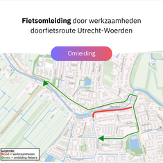 Er wordt hard gewerkt aan de doorfietsroute Utrecht-Woerden. Door deze werkzaamheden gelden er wel regelmatig omleidingen. De komende periode wordt er gewerkt aan de weg bij de Uitweg, tussen de kruising met Haanwijk en de kruising met de Kalverstraat/Kerkweg in Harmelen. De weg bij de Uitweg is tijdelijk dicht. Het kan dus zijn dat je even een stukje moet omfietsen. De omleidingsroute staat op de kaart hieronder uitgelegd. Langs de weg staat het uiteraard ook aangegeven met gele borden. Je kunt de omleidingsroute in beide richtingen gebruiken.
