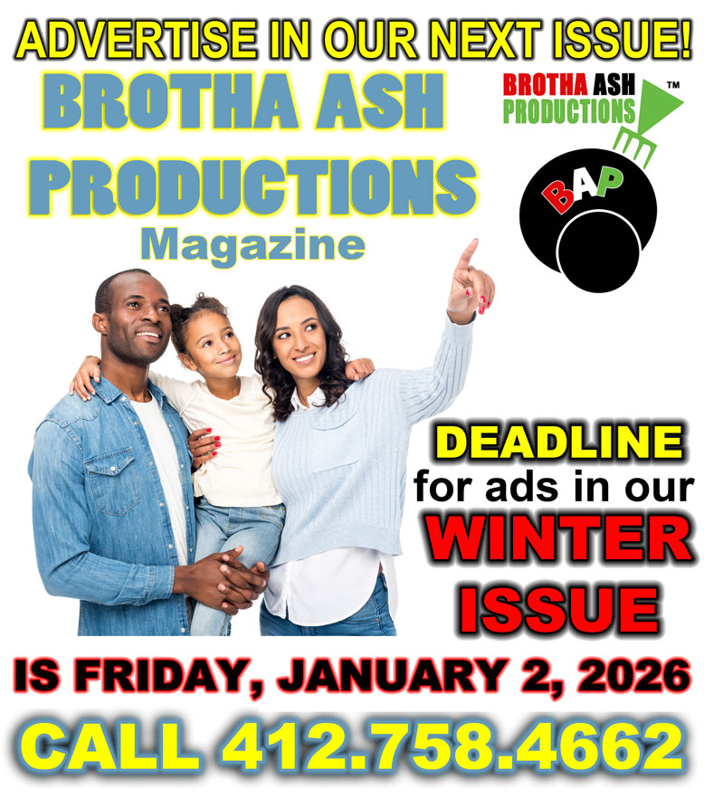 HERE and click on BROTHA ASH PRODUCTIONS MAGAZINE "FALL ISSUE" IS OUT EVERYWHERE AND THE DEADLINE TO SUBMIT ADS FOR OUR WINTER ISSUE IS FRIDAY, JANUARY 2, 2026!