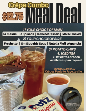 Cider is the crêpe beverage of choice in France, and we highly recommend it here, too. Luckily, we have superb local ciders available. We love Black Apple's fruity options--they go especially well with our sweet crepes. Watch for Bentonville Brewery's "Scrumpy," coming soon--an extra-dry option that's perfect with our savory crepes!