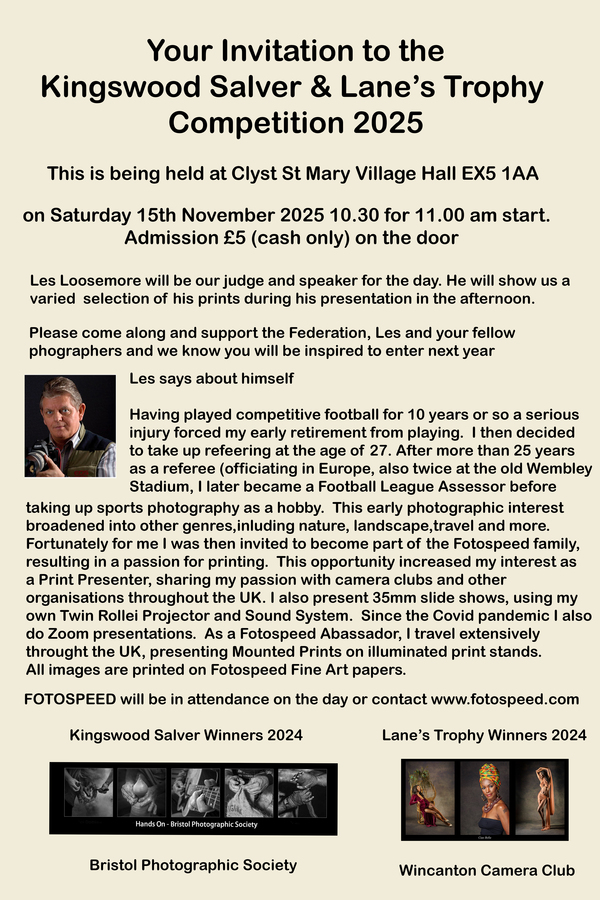 The closing date for the second round of this season’s print competition is next Wednesday, 19 November and there is a box awaiting your entries on the stage in Unit 13.