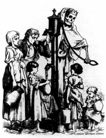 The picture above depicts Dr. Snow removing the handle from the Broad St. pump. Below, an artist's rendition of the deadly pump before Dr. Snow's discovery. For more details.