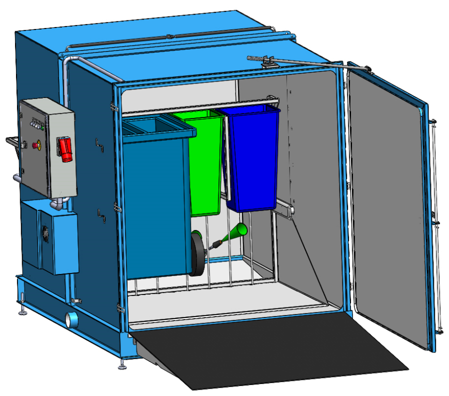 Tvättar samtidigt ett 2-3 hjuligt 4-facks kärl och insatserna.