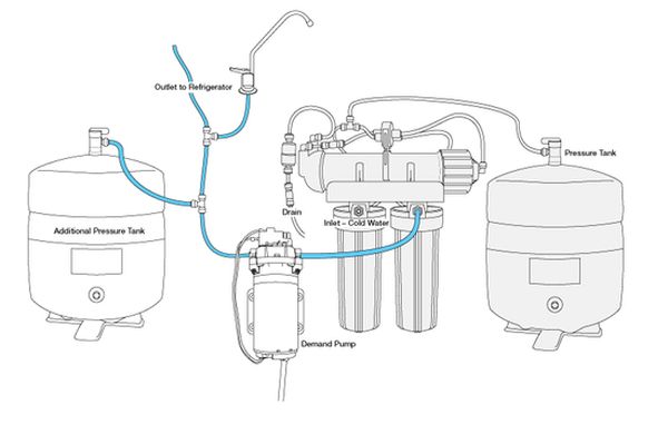 The illustration below shows a demand pump installation on an undersink reverse osmosis unit designed to send pressurized water to a remote refrigerator or icemaker. This is a good design, but there are other placement options. If the pump is installed in tube labelled “Outlet to Refrigerator,” the sink-top spigot will get water only from the tank at right and the pump will not turn on to serve the sink-top spigot.