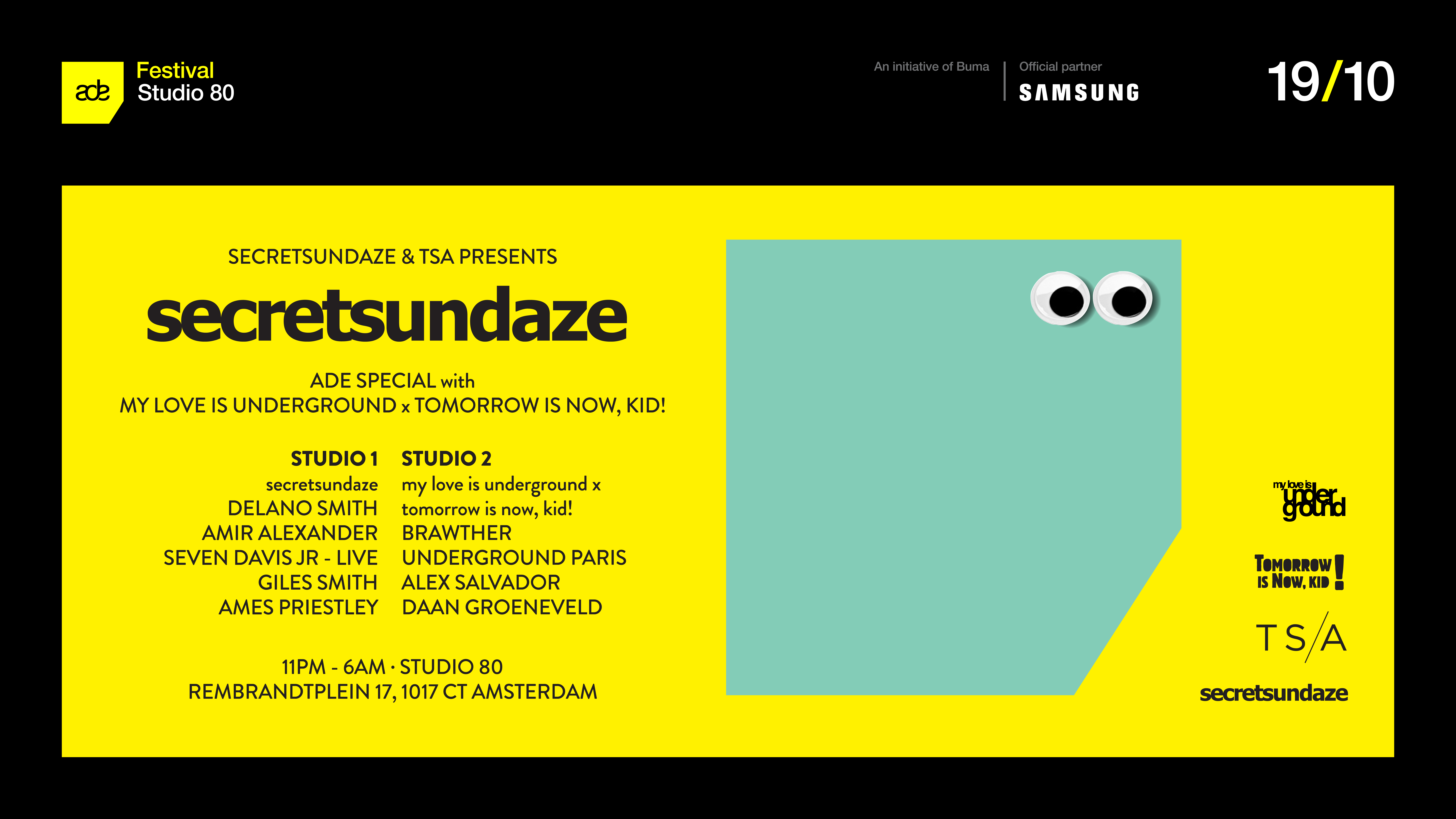 So it's ADE time again... secretsundaze are partnering up with our long term friends and partners at Studio 80 for a triple whammy with 3 labels representing across the 2 rooms. We will host the main room with Delano Smith, Amir Alexander, Seven Davis Jr - Live and of course James and Giles. Room 2 will be co-hosted by My Love is Underground with Underground Paris and Brawther going head to head with the Tomorrow is Now, Kid! crew from Amsterdam with Alex Salvador and Daan Groeneveld.