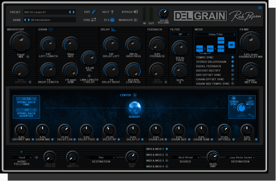 You will see that DelGrain has a lot in common with DelSane, like the creative Disrupt Sphere. The difference is that DelGrain offers a Delay that plays back audio in a granular, or grainy, way. The granular change to the audio can be placed ahead of the Delay, inside the Delay, after the Delay, or parallel to the Delay..