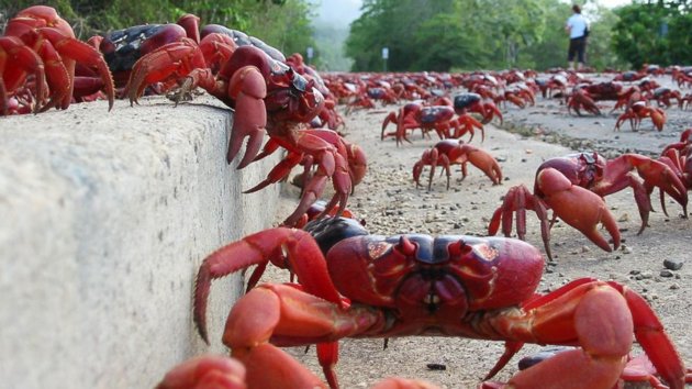 Millions upon millions of red crabs on Australia's Christmas Island are shutting down roads, covering beaches and stopping people in their tracks. They're on their way to the Indian Ocean.