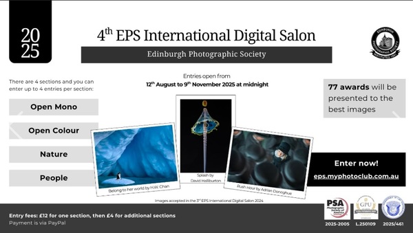 This is a friendly, light-hearted Open projected image competition with the two sides battling it out on the night. (The subject is Open and is changed from what was previously announced, to make it less restrictive.)