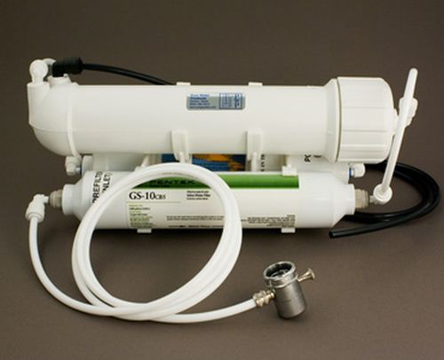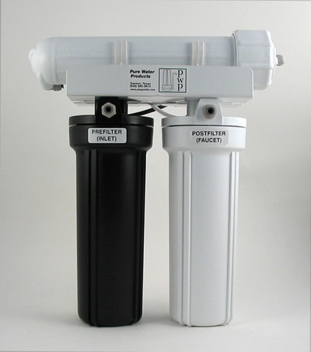 The unit pictured at the top of this article is one of Pure Water Products' standard countertop RO configurations. It's a simple, three-stage RO unit that uses standard inline carbon filters and a conventional standard-sized membrane. All parts are readily available and easily replaceable. It produces water at the rate of about 2 gallons per hour.