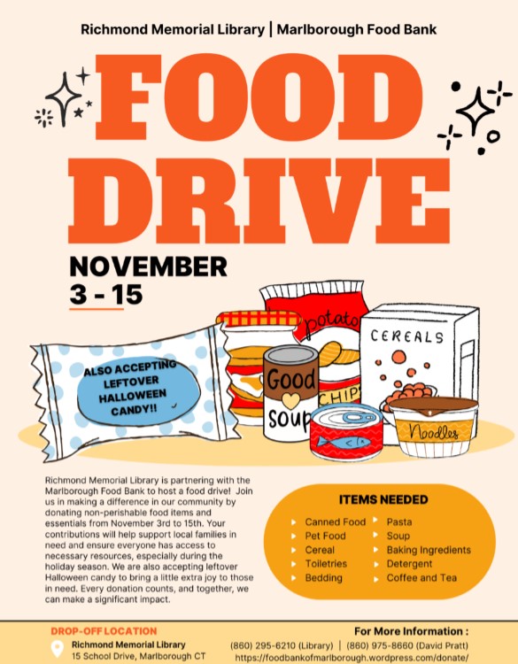 We will be partnering with the Marlborough Food Bank for a Food Drive beginning Monday, November 3 through Satruday, November 15. Join us in making a difference in our community by donating non-perishable food items and essentials. Some everyday items that are always needed include both dish and laudry detergent, deodorant, diapers, shampoo, and toothpaste. Food items that are needed include cereal, baking mixes and frostings, vegetable oil, flour, sugar, apple sauce, and coffee or tea. Leftover Halloween candy will also be accepted as a treat to those who may need a little extra joy right now.